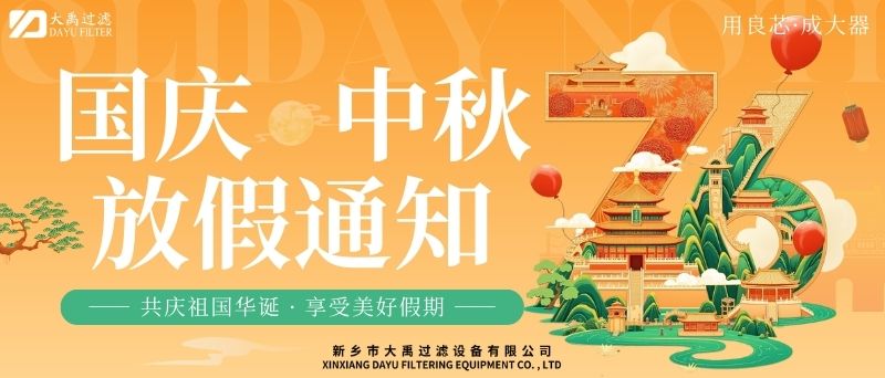 尊敬的客戶及合作伙伴:秋風送爽,丹桂飄香。值此國慶與中秋雙節(jié)來臨之際,謹向您及家人致以zui誠摯的節(jié)日祝福!根據(jù)國家法定節(jié)假日安排,結(jié)合公司實際情況,現(xiàn)將2025年國慶+中秋雙節(jié)放假安排及相關事項通知如下:一、放假時間2025年10月1日(星期三)至10月6日(星期一),共計6天。10月7日(星期二)起正常上班。9月28日(周日)、10月12日(周日)補班。二、業(yè)務服務說明放假期間,公司線上咨詢通道保持暢通。銷售人員將不定期查看并回復您的咨詢,但受假期影響,可能存在回復延遲的情況,敬請諒解。如遇緊急事項,您可撥打以下熱線:王經(jīng)理13613905650;李經(jīng)理13839073363,我們將竭誠為您服務。三、生產(chǎn)安排提醒因車間節(jié)前生產(chǎn)訂單已排滿,為確保假期前后生產(chǎn)質(zhì)量與效率,放假期間(10月1日至10月6日)將暫停安排新生產(chǎn)訂單生產(chǎn)。節(jié)前已下單的訂單將按原計劃正常推進,放假期間新接訂單將統(tǒng)一順延至10月7日復工后,按序安排生產(chǎn)。由此帶來的不便,我們深表歉意,感謝您的理解與支持。四、溫馨提示假期出行請注意安全,做好個人防護。公司官網(wǎng)及社交媒體平臺將持續(xù)更新節(jié)日動態(tài)及服務資訊,歡迎隨時關注。佳節(jié)共團圓,服務不間斷。值此雙節(jié)同慶的美好時刻,衷心感謝您長期以來對我司的信任與支持!我們期待在節(jié)后以更飽滿的熱情、更優(yōu).質(zhì)的服務與您攜手同行,共啟新程!此致敬禮!新鄉(xiāng)市大禹過濾設備有限公司2025年9月28日
